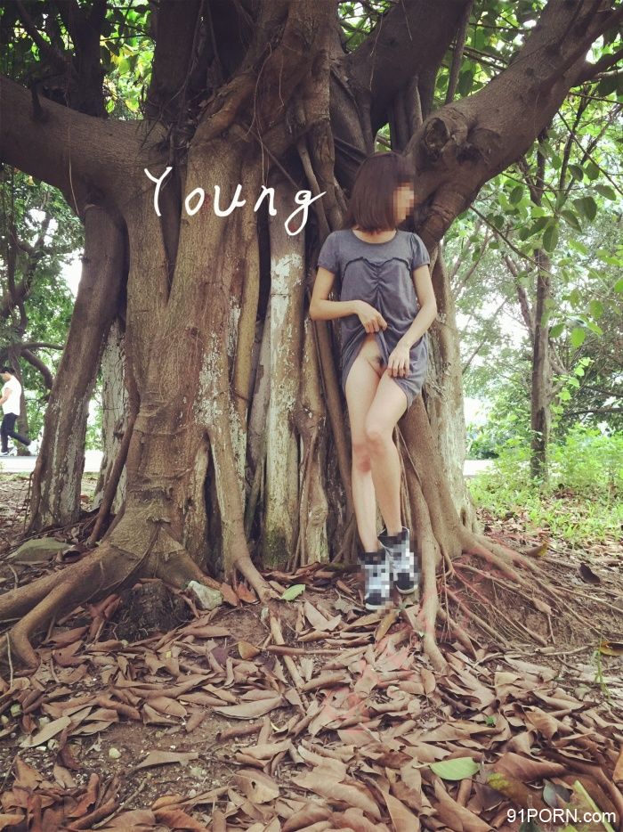 赤足灰裙踏绿道,路旁榕树体妖娆,壁侧撩衣佳人立,芳臀玉腿门中俏。