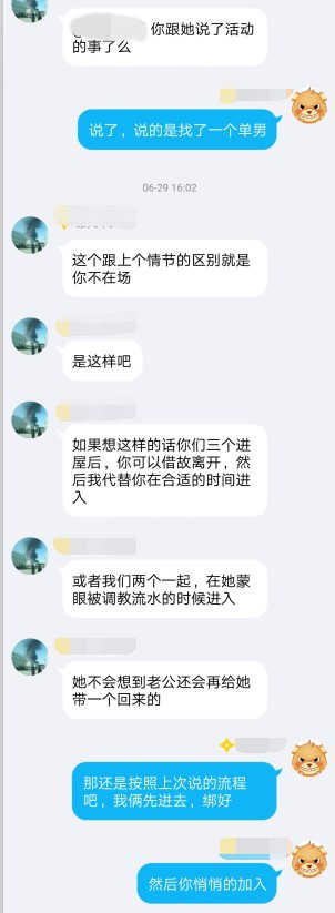 本次活动是告的老婆找单男3P,其实是一次找了2个单男,在老婆被第一个单男捆绑蒙眼的情况下,让第二个单男悄悄进入房间,来个惊吓,过程很刺激,让老婆感受了下混乱的感觉。