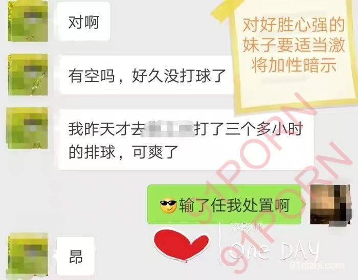 简单介绍一下流程,和妹子相识于本市大学,妹子艺术系,学校排球社团二传,喜欢体育,摄影游戏,本次是搭讪认识。因为大学是个认识妹子绝佳的地方。但是本人没有大牛,也没有bba,不能在车上放水,只能通过搭讪,认识收号,这相当于学校就是个猎场,妹子是猎物。当然了,如果你硬件很好比如你很帅或者有豪车,也可能你被妹子放猎物。当然我都没有,所以搭讪相处是门技术活,想学技术的单男可以加我学习,但是没有免费的午餐,我肯定能让你有收获。收号以后聊了几天,发现妹子性格比较好胜,于是采取爱恋36计里的激将法!约妹子运动,比赛,聊天图片中可以看出,挑逗还比较成功!后来酒店顺势推倒。再后来妹子比较喜欢我,还拍了一组自拍照给我,在经过她允许的情况下,不露脸,不露点任我处置照片。福利不大,但是单男可以学点经验