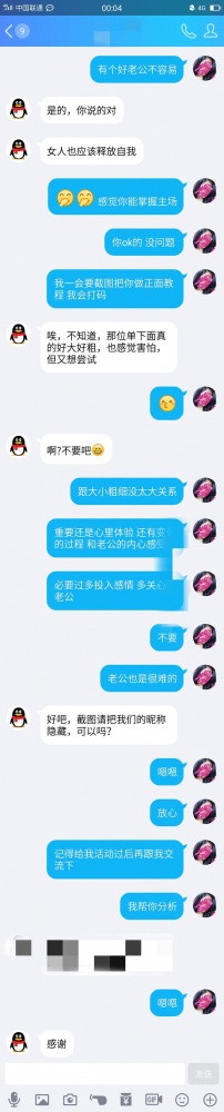 与夫妻分开之后,第二天的下午,对方丈夫(以下简称小c)小c给我发来了短信,问我昨天感觉如何? 我开玩笑的说:感觉一般,你太小了! 小c:啊,我也知道,我的确不是很大,是不是没有高潮啊?我说:没有,不过还好虽然小但是也够用,我不需要太大的,如果需要大的我就找老外了! 小c看出我在逗他 于是回答:那我的应该够用了,主要还是看感觉嘛,男人女人如果没有感觉,很难去高潮,我看到你那么有女人味,而且波涛汹涌,我就认定你了,心跳砰砰的,一直想要偷偷要你的wx,却没想到被你先下手了! 我还是比较保守哈哈! 我说:切,鬼才信! 那你不要我的还要我主动! 不过心里却很有感觉,因为我不太喜欢很油嘴滑舌的男人,看他老实,就加了他!