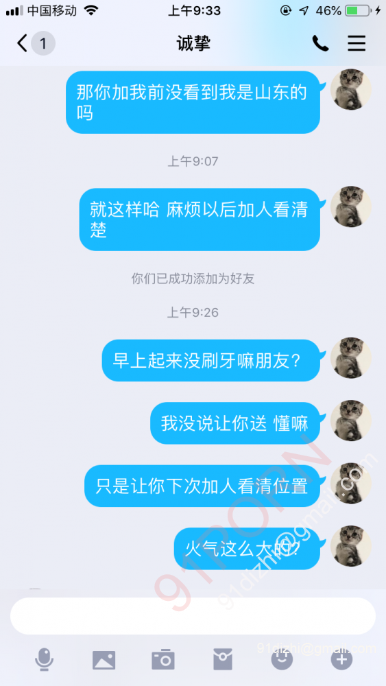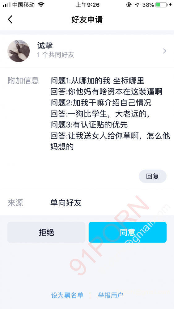 然后该老哥就爆发了 对于他说的这三句话 我想告诉你 第一 我没有任何形式的装逼 都是正常交流 谁也没有高人一等 第二 狗比学生什么鬼?难道您是个大老板或者什么很厉害的人物?谁不是从学生时代过来的 第三 我从来也没有以任何形式让你把女人送来让我艹 之前的帖子说得很清楚 就是交友为目的 合适了可以一起活动旅游 你们想来山东玩我来招待安排 本想他可能是误会了 加上好友想去解释一番没想到发生下面的事情