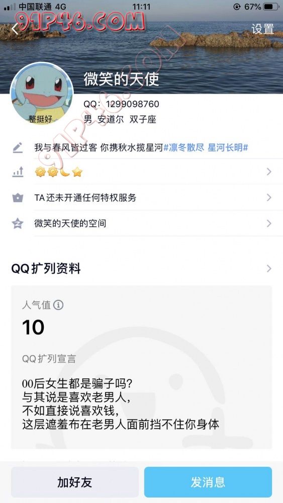5,大家都是在91这个平台相识的,所以真的只找有素质的,吃白食的真的也不合适 所以吃白食的人就真的互不打扰吧。思来想去还是设置门槛 真的只为给我节约时间,和阻止想吃白食的人加我。希望能理解。