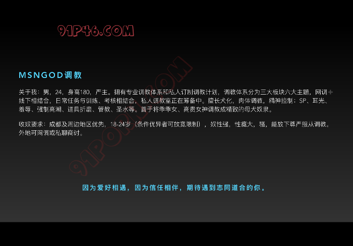 要求:年龄18-26,奴性强,性瘾大,骚,下贱,服从,接受全方位调教。