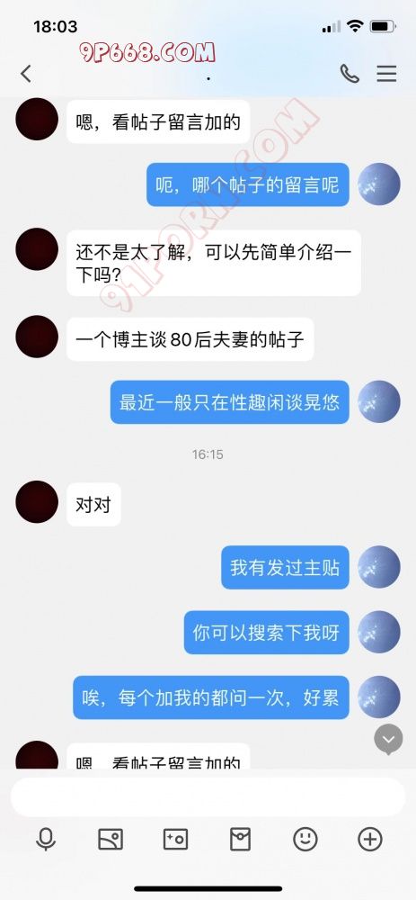 今天翘班,在租住的公寓无聊,刚想睡觉,有人加我,一看有自我介绍,觉得还行,但是聊一会就让我介绍我的情况,我以为又是那种加很多人,最后不清楚加的是谁的那种人,就没好气的说看帖子,他说没注册,我就贴了几个帖子的链接给他看