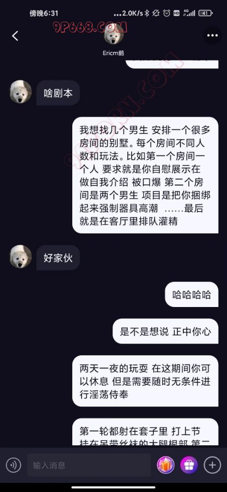 本帖女主是一周前在SM软件认识,一开始极限拉扯,女人永远都是心通往她的阴道。几天拿下,开始对我吐露自己的性癖。以前有过一个主,被带着和他的发小们经常玩群P,有时一周2次,服用长期避孕药,喜欢被集体灌精。现在主走了,小骚货几个月没被轮忍不住找到了我。于是有了以下聊天记录(做爱部分是第一帖的情趣店女主):