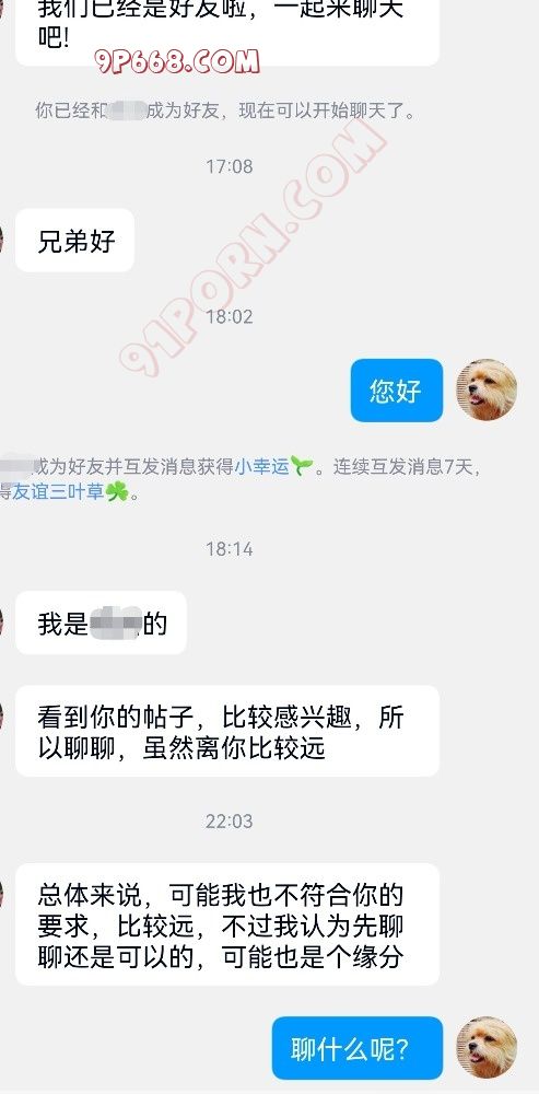 其实当时好想把他直接删除拉黑,想想还是算了,没必要那么较真,所以就没回他消息,22:03分,他又发来一条消息,又张口就来个“你”,然后说“不过我认为先聊聊还是可以的”!我当时真想会他一句“我不要你认为,我要我认为”,哈哈哈,不过我还是忍了,回了他一句“聊什么呢?”,这句话隐含的意思不就是“我没什么和你可聊的”吗?这意思不比秃子头上的虱子更明显吗?好家伙,他接下来整了一句:“说不定机会就来了”,我了个去,这句话差点把给我干自闭了,当时甚至一度想退圈了,至少想把我所有贴子的QQ给删了,真的!这TM哪跟哪啊?,机会就来了,而且还是说不定,这TM我们是不是还得好好把握啊?因为这个机会是“说不定”的!写到这儿实在不想再说什么了,实在说不下去了,感觉为91论坛上的小白单男真是操碎了心,忧国忧民的情怀都干激发出来了!