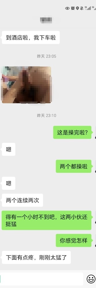 到酒店后,实习生同学就先忍不住,抱着媳妇就猛亲起来,衣服都是那时候乱脱的,脱到裤子的时候媳妇说她自己惊讶了,实习生同学也惊讶了。媳妇是看见这同学的大屌,一点都不比实习生小,虽然媳妇玩过的屌也好几根了,但是平时她在一些平台上聊的要不就是PS的假屌,要不都是正常型号居多,但是这个晚上遇到两个大屌倒是很兴奋,实习生同学的震惊,是第一次看见女生穿开档丝袜,媳妇这次是穿了丁字裤,所以很好脱了内裤,而且穿了运动鞋的脚,因为丝袜不透气,所以还是有点味道的,没想到这个同学还挺喜欢这个味道。脱了鞋就给她舔脚了,这时候实习生也脱了衣服过来了一个舔脚一个舔逼,媳妇说当时都没洗,汗味和尿味还是有些的,这两年轻都没嫌弃,反而津津有味,很快媳妇就舔得受不了了,让两男生戴套就操了起来,姿势上面我问了,都是传统的前口后操,倒是两男生节奏很猛,不到一个小时两人都射了两次,媳妇才去洗澡了,洗澡后回去两个男生都好兴奋,媳妇给同学用脚打了一次,给实习生再口了一次。后来三人抱着裸睡了一晚。
