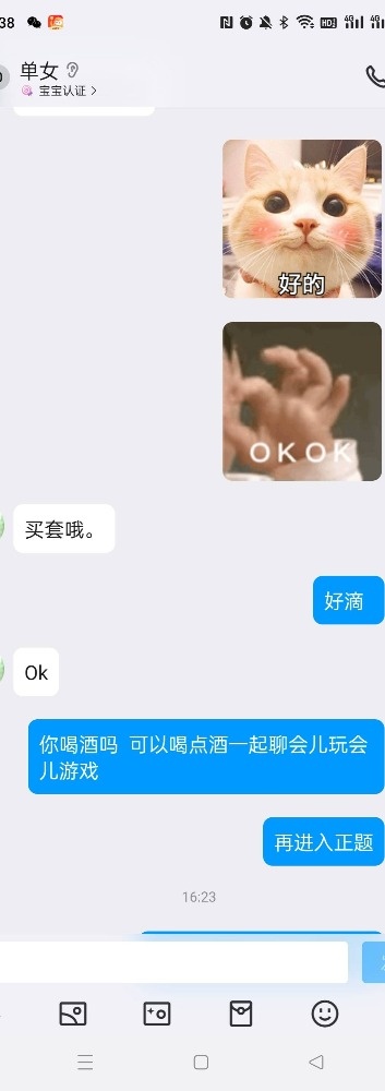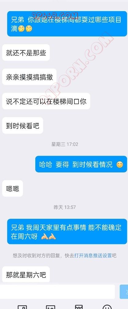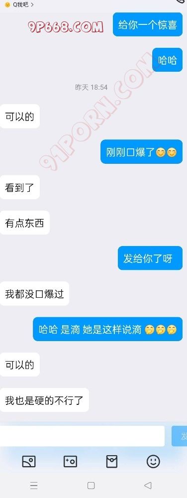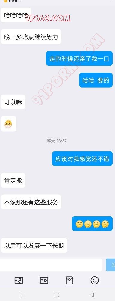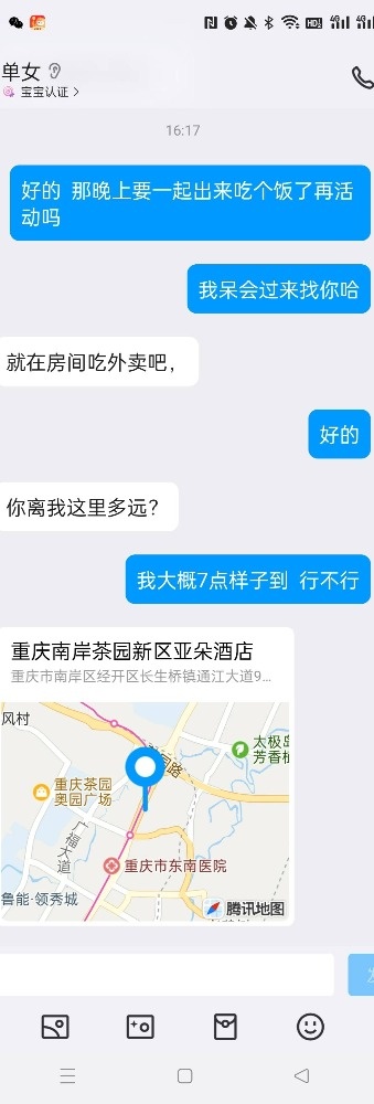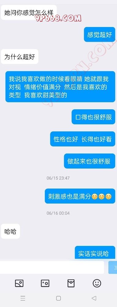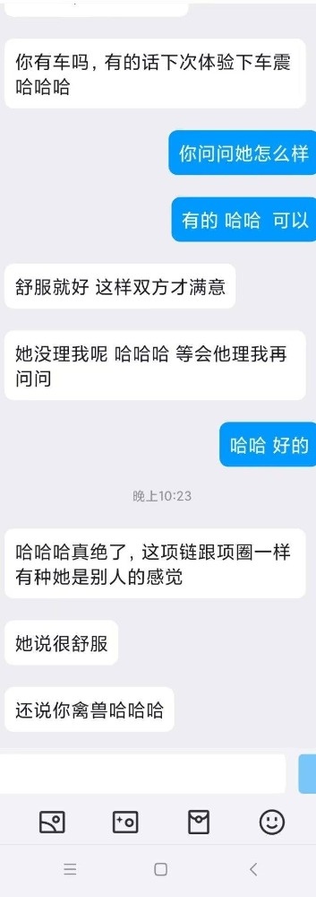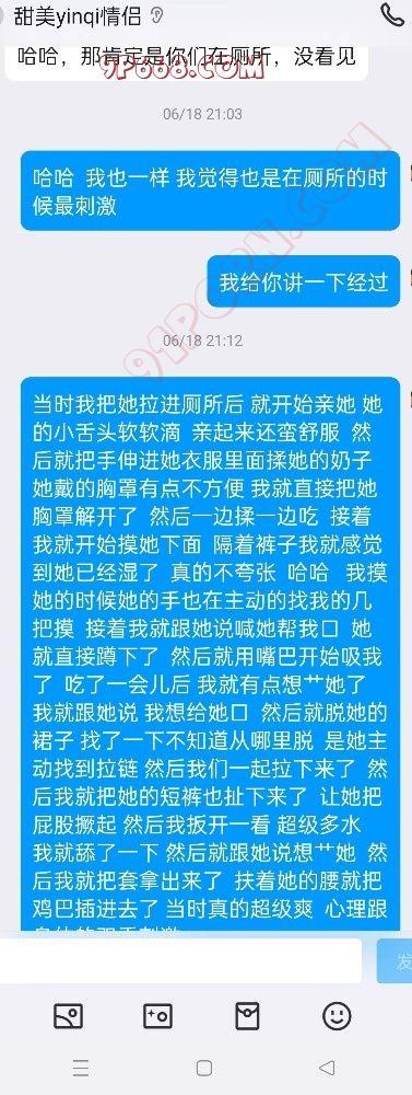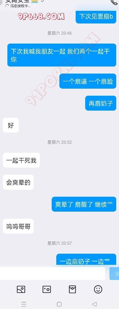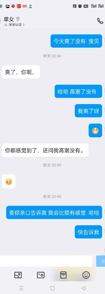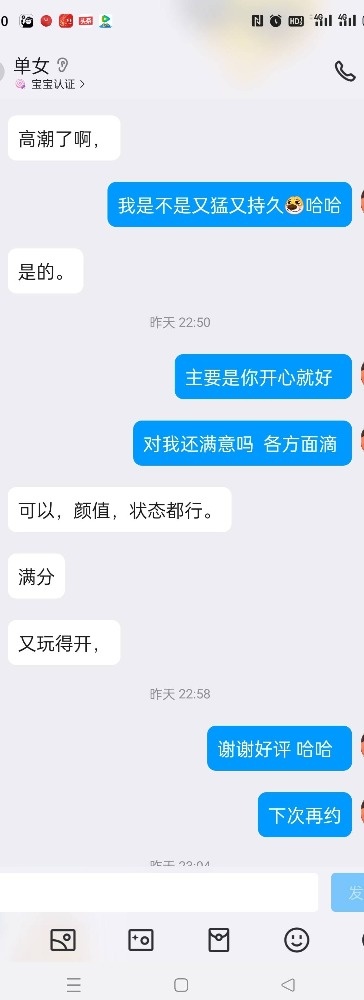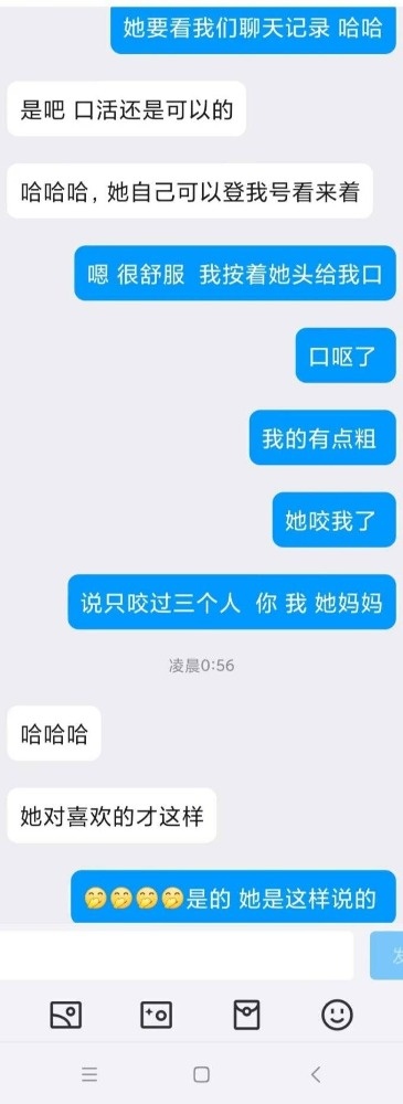 女主的闺蜜跟我活动过一次,说我活好人帅,女主是外地的来重庆玩,她闺蜜就把我推荐给了她,我先是带她去吃了个网红串(她开始要吃外卖,因为没洗头,后面被我说服了)。吃饭的时候我问她想不想3p,最后在我的细心引导下同意了,我也是叫上了ktv4p的那个兄弟一起,先我一个人操她,我兄弟后面才来,那是我兄弟第一次玩3,激动得硬不起来。好在我把女主治得服服帖帖的。上图(只有聊天记录,不让拍照)