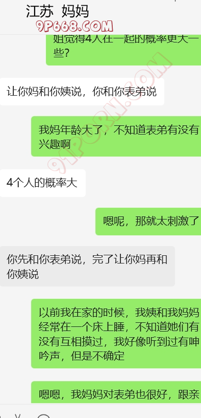 加入和表弟,我姨和我妈妈的4p话题,还有我妈妈和我姨的女女话题,哈。她还在那一本正经的帮我出主意,怎么才能4p。找了个粉丝,演我表弟,和表弟的对话发给她看。