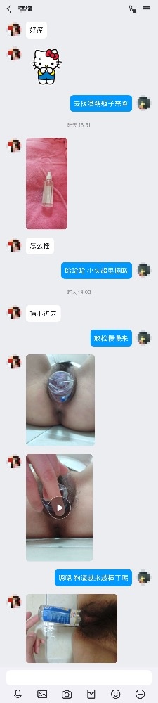 既然出现了,那必须继续调教玩弄起来咯!家里的玩具怕她妈发现都扔了,只能就地取材,所以有了鸡蛋塞狗逼,酒精瓶子插逼的戏码,详见聊天记录吧。