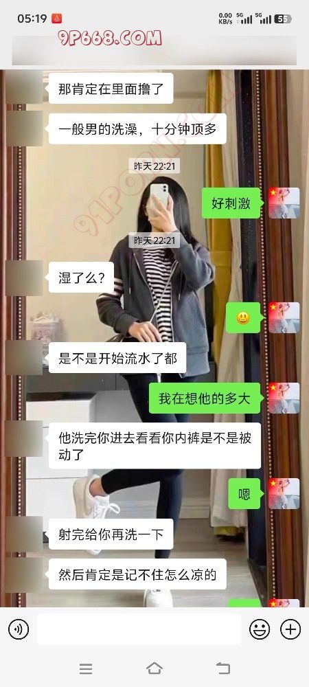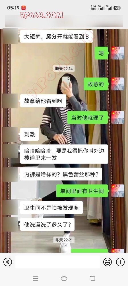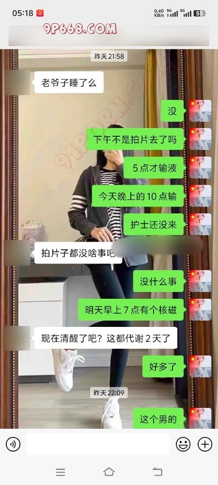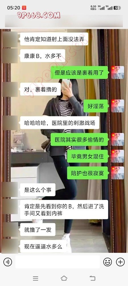 这几天一直在医院陪护,我爸做了一个手术,医院快热死了,中央空调不给开,病房窗户又好小,感觉像一个蒸笼,还好是一个双人房,另一个陪床的是个30来岁的男的,长得人高马大的,这好几天没聊骚了,对于一个性欲强的女性来说还是挺难受的,晚上好几次不由自主的伸到内裤里,这陪护挺能说的,聊了半天我去洗澡了,本来不想在医院洗澡,但是感觉身上黏糊糊的,我爸还不能下床,洗完澡换了个宽松的短裤,感觉凉爽了很多,我们两个陪护的小折叠床都是贴着墙放的,直角结构,正好有个绿帽朋友和我说他老婆晚上9点多去跟教练练车了,去好几天了每天晚上11点多回来,他鼓励她勾引教练,估计天天晚上被教练开车,我们讨论的心潮澎湃,我感觉我已经流水了,稍后我大胆的撇开了腿,躺在折叠床上,短裤与大腿空隙很大,我用余光看到了他在看我,我感觉他看到了我的b了,因为我洗澡后没穿内裤,这算是一种勾引把,莫名其妙的感觉好刺激,他起身经过我的时候我看到了他裤裆鼓鼓的,应该是硬了,然后他问我上厕所吗,如果不上他就洗澡,我说上,当我上厕所的时候我把内裤挂在了喷头对面的毛巾架上,然后跟我一个朋友讨论这件事,我们都觉得好刺激,也不知他偷用我的内裤没,附上聊天记录