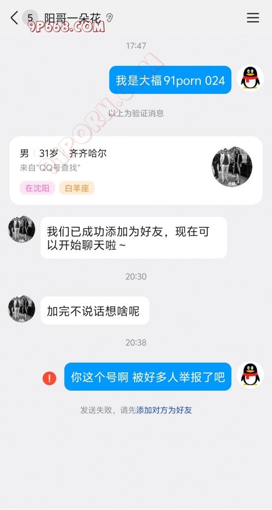 你口也太急了,这个qq不知道让多少人举报了,加的时候得验证好几次,啥时候通过的都不知道,但是上来就这么开场的,也是素质极佳了,诶沈阳现在也是老倒子多了,会好好说话越来越少了。
