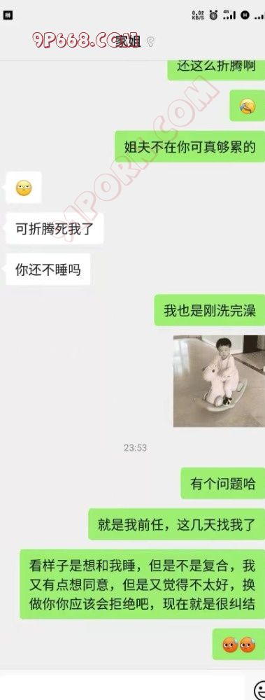 男生加了我的微信之后,急不可耐的要开始。我让他按住性子一步一步来。首先从恋爱的问题切入,谎称告诉男生的前任来找他复合,但是他很纠结。姐姐顺着话题问他为什么纠结,他就说怕沉迷。姐姐很纳闷,为什么会沉迷呢?因为…怕经常做爱——话题很自然切换到性,可以看聊天记录