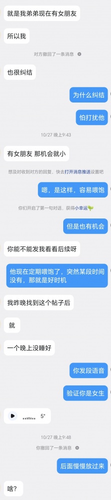 姐姐假装洗澡回来后,等来的是弟弟一堆的信息,主要还是恋爱,这个可以不看,就是吐槽恋爱怎么怎么不顺。有过经验的同志可以看得出来,这是话题切入,从恋爱开始