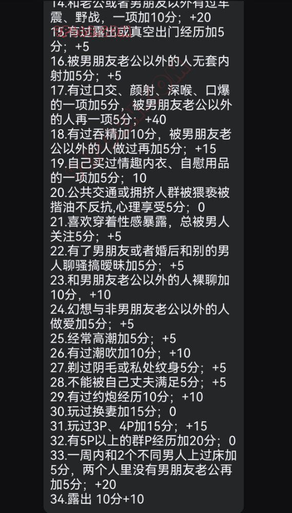 12.拍露脸裸照、视频发给男朋友老公以外的男人,一项加10分,以此类推;
